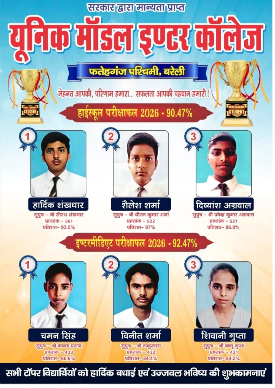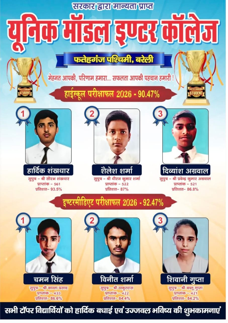 फ्रंट न्यूज नेटवर्क, फतेहगंज पश्चिमी-बरेली। हाईस्कूल बोर्ड परीक्षा-2026 में हर साल की तरह ही इस बार भी यूनिक मॉडल इंटर कॉलेज फतेहगंज पश्चिमी के कई मेधावी स्टूडेंट्स ने अपनी काबिलियत का डंका खूब बजाया है। हाईस्कूल के मेधावी छात्र हार्दिक शंखधार 93.5% ने बरेली जिले की टॉप टेन लिस्ट में शामिल होकर अपने कॉलेज और परिवार का मान बढ़ाया है जबकि इंटर में चमन सिंह ने 86.6% प्राप्तांक बटोरकर कालेज और फतेहगंज पश्चिमी क्षेत्र को गौरवान्वित किया है। इनके अतिरिक्त हाईस्कूल में इसी कॉलेज के 2- शैलेश शर्मा87% 3- दिव्यांश अग्रवाल 86.8% 4- अग्रिम! गुप्ता 86.66% 5- मानवी गंगवार 86.33% 6- सचिन86.1% 7- दीपांशु85.3% 8- फलक अंसारी85% 9 शहजिल हुसैन84.16% 10- कुणाल ने 83.8% Atleast हासिल कर कालेज की शान बढ़ाई है।