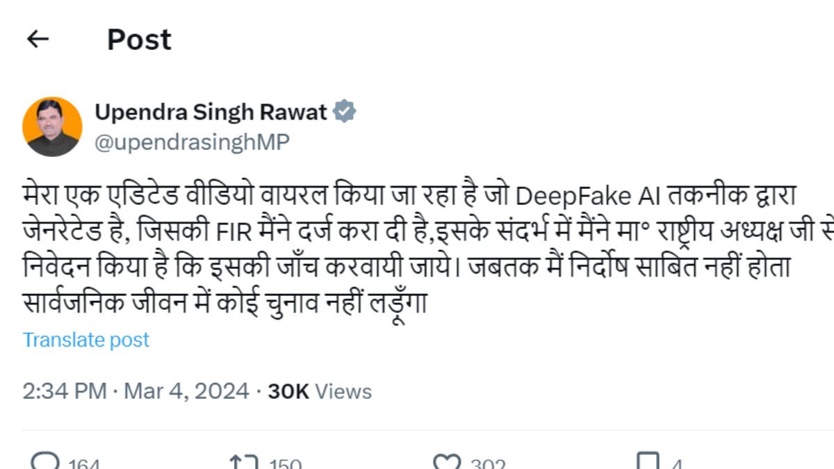 उपेंद्र रावत ने एक्‍स पर ल‍िखा, ”मेरा एक एडिटेड वीडियो वायरल किया जा रहा है जो DeepFake AI तकनीक द्वारा जेनरेटेड है, जिसकी एफआईआर मैंने दर्ज करा दी है, इसके संदर्भ में मैंने मा॰ राष्ट्रीय अध्यक्ष जी से निवेदन किया है कि इसकी जाँच करवायी जाये। जबतक मैं निर्दोष साबित नहीं होता सार्वजनिक जीवन में कोई चुनाव नहीं लड़ूंगा।”