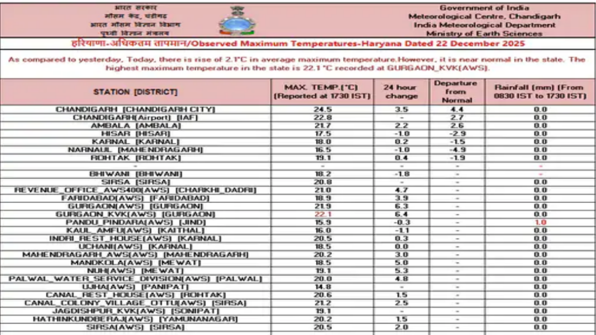 घनी धुंध का अलर्ट: मौसम विभाग के मुताबिक 24 दिसंबर से मौसम बदलेगा. ज्यादा तापमान गिरने की संभावना है. राज्य में सबसे कम तापमान 22 दिसंबर की सुबह 6.0 दर्ज किया गया. जबकि अधिकतम तापमान गुरुग्राम जिले में 22.1 डिग्री दर्ज किया गया. वहीं, मौसम विभाग ने राज्य के 8 जिलों में घने कोहरे का अलर्ट जारी किया है. यमुनानगर, करनाल, पानीपत, सोनीपत, झज्जर, फरीदाबाद और गुरुग्राम के लिए यह अलर्ट जारी किया गया है.