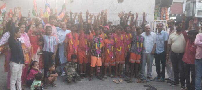 एफएनएन, किच्छा : कांग्रेस नगर अध्यक्ष भूपेंद्र चौधरी के प्रतिष्ठान पर देर शाम हरिद्वार से गंगाजल लेकर पहुंचा कवारियो के पहुंचने कांग्रेस पार्टी पदाधिकारियो ने फूल मालाओं से लाद कर स्वागत किया। कार्यक्रम के दौरान भूपेंद्र चौधरी ने बताया कि गंगाजल लेने रवाना हुए कावड़िए बहेड़ी के मुंडिया से विगत 22 दिन पूर्व निकले थे तथा आज नगर पहुंचने पर कांग्रेस कार्यकर्ताओं द्वारा कावड़ियों का स्वागत किया गया जिसके उपरांत देर शाम कावड़ियों द्वारा जलपान ग्रहण कर प्रातः कार्यालय से रवानगी की गई। इस मौके पर मुख्य रूप से भूपेंद्र चौधरी केवल गुड़िया अशोक मित्रा नितिन शर्मा सहित दर्जनों कांग्रेसी कार्यकर्ता उपस्थित थे।