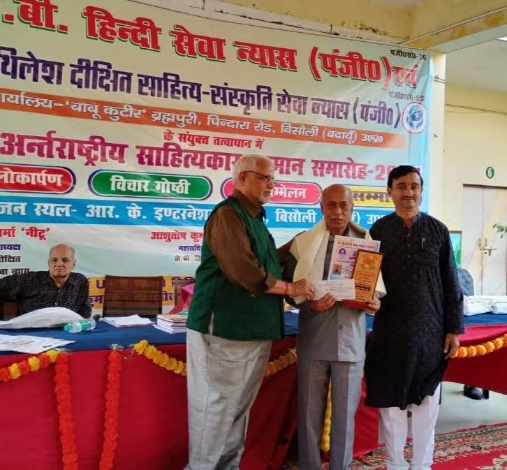 फ्रंट न्यूज नेटवर्क ब्यूरो, बरेली। के०बी०हिन्दी सेवा न्यास(पंजी०) बिसौली (बदायूं) के तत्वावधान में आयोजित 11वें साहित्यकार अभिनन्दन समारोह में मूर्धन्य कवि-साहित्यकार डॉ. महेश मधुकर को सुहागवंती सेठी स्मृति साहित्य भूषण श्री सम्मान से अलंकृत किया गया। सम्मान समारोह बिसौली के आर०के०इन्टरनेशनल स्कूल में सुप्रसिद्ध साहित्यकार डॉ मिथिलेश दीक्षित ‘साहित्य भूषण’ की अध्यक्षता तथा साहित्यकार/समाजसेवी अशोक खुराना के मुख्य आतिथ्य में संपन्न हुआ।