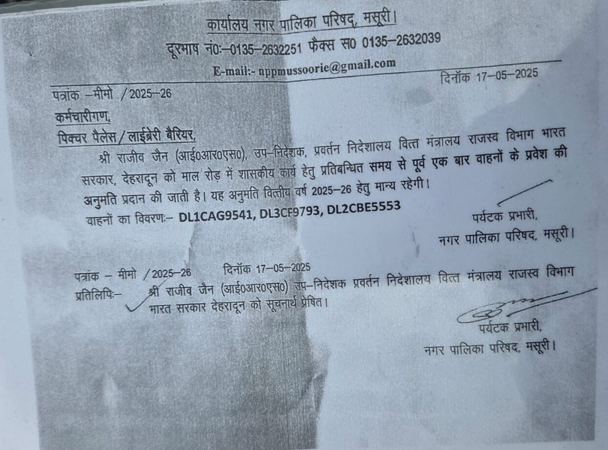 एफएनएन, मसूरी: शहर के माल रोड पर प्रतिबंधित समय में वाहनों के प्रवेश को लेकर एक बड़ा मामला सामने आया है. नगर पालिका परिषद द्वारा पिक्चर पैलेस और लाइब्रेरी बैरियर से राजीव जैन, आईआरएस, उपनिदेशक प्रवर्तन निदेशालय (वित्त मंत्रालय, भारत सरकार, देहरादून) के नाम पर कुछ वाहनों को शासकीय कार्य हेतु विशेष अनुमति दी गई थी. लेकिन अब इस अनुमति की आड़ में पर्यटकों के अवैध परिवहन और टैक्सी संचालन का आरोप लग रहा है.