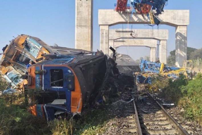 बैंकॉक से उत्तरपूर्वी थाईलैंड जा रही एक ट्रेन पटरी से उतर गई, जब एक निर्माण क्रेन ट्रेन के एक डिब्बे पर गिर गई। नाखोन रत्चासिमा प्रांत के स्थानीय पुलिस प्रमुख थचापोन चिन्नावोंग ने बताया, “22 लोगों की मौत हो गई और 30 से अधिक लोग घायल हो गए।”
