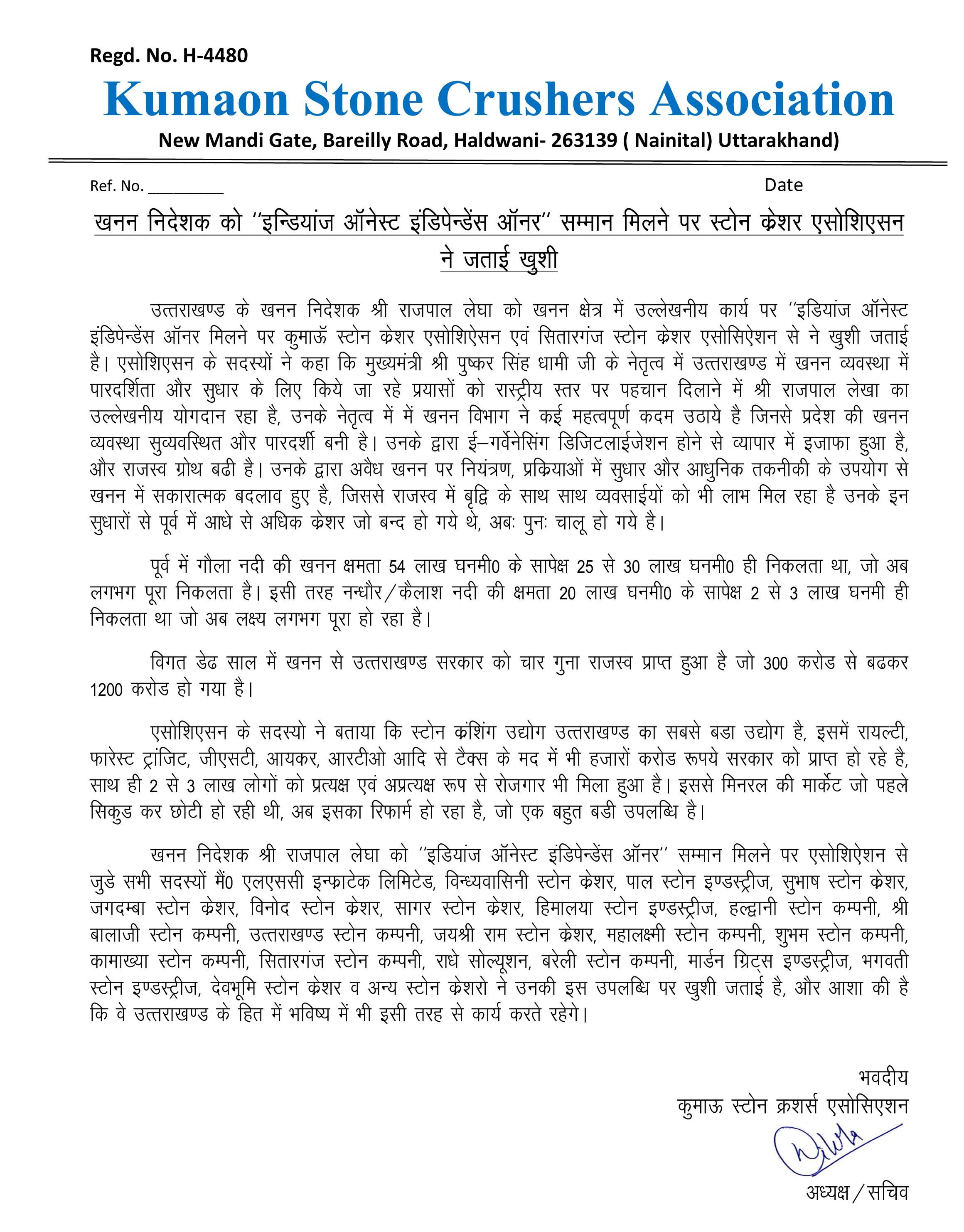 खनन निदेशक श्री राजपाल लेघा को इडियांज आनेस्ट इंडिपेन्डेंस आनर सम्मान मिलने पर एसोशिऐशन से जुडे सभी सदस्यों मैं0 एलएससी इन्फ्राटेक लिमिटेड, विन्ध्यवासिनी स्टोन क्रेशर, पाल स्टोन इण्डस्ट्रीज, सुभाश स्टोन क्रेशर, जगदम्बा स्टोन क्रेशर, विनोद स्टोन क्रेशर, सागर स्टोन क्रेशर, हिमालया स्टोन इण्डस्ट्रीज, हल्द्वानी स्टोन कम्पनी, श्री बालाजी स्टोन कम्पनी, उत्तराखण्ड स्टोन कम्पनी, जयश्री राम स्टोन क्रेषर, महालक्ष्मी स्टोन कम्पनी, षुभम स्टोन कम्पनी, कामाख्या स्टोन कम्पनी, सितारगंज स्टोन कम्पनी, राधे सोल्यूषन, बरेली स्टोन कम्पनी, मार्डन ग्रिट्स इण्डस्ट्रीज, भगवती स्टोन इण्डस्ट्रीज, देवभूमि स्टोन इण्डस्ट्रीज व अन्य स्टोन क्रेशरों ने उनकी इस उपलब्धि पर खुषी जताई है और आशा की है कि वे उत्तराखण्ड के हित में भविष्य में भी इसी तरह से कार्य करते रहेगे।
