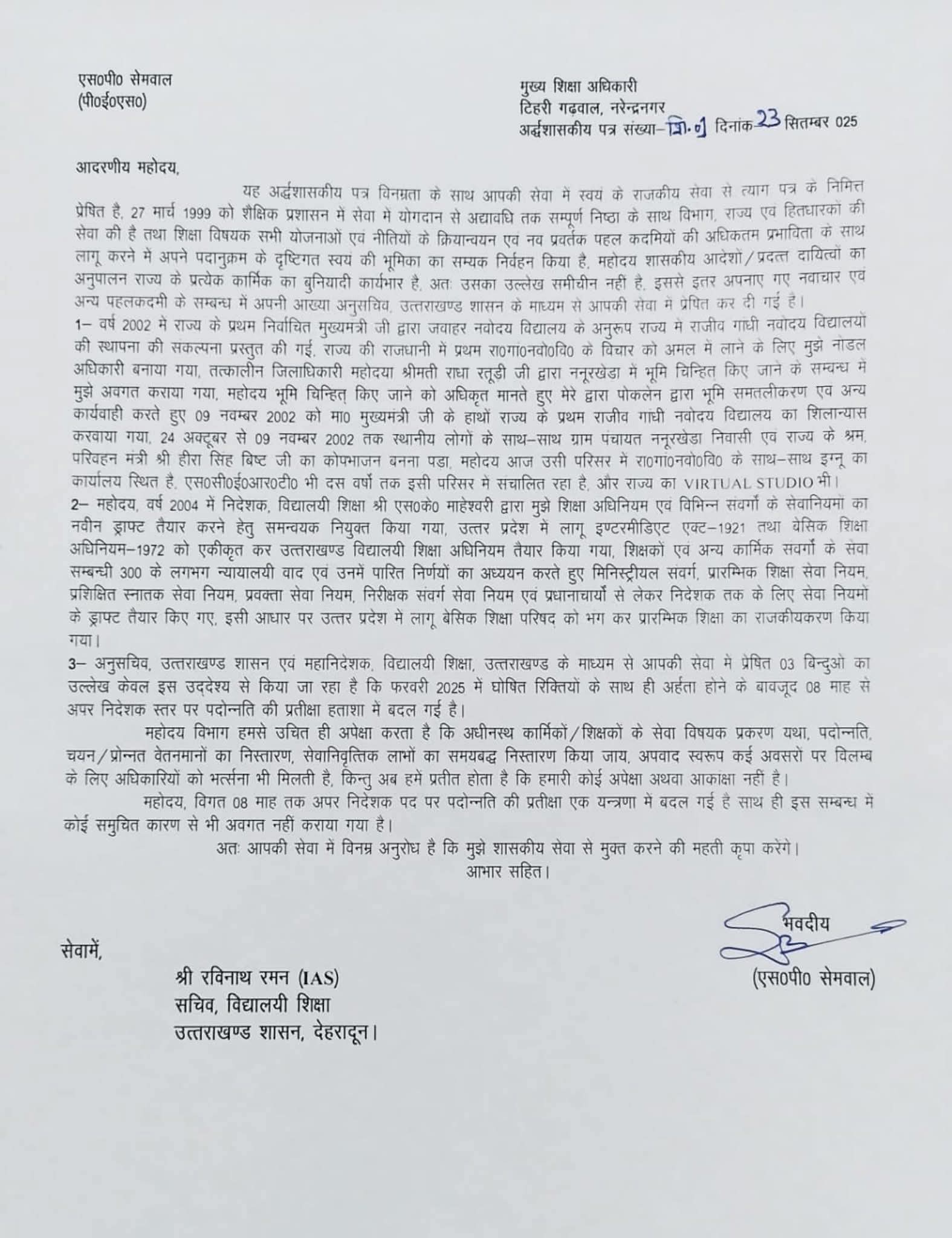 टिहरी के मुख्य शिक्षा अधिकारी एसपी सेमवाल ने राज्य के शिक्षा सचिव रविनाथ रमन को पत्र लिखा है. जिसमें उन्होंने इस्तीफे की वजह बताई है. पत्र में एसपी सेमवाल ने प्रमोशन का जिक्र किया है. उन्होंने लिखा है कि कई महीनों के बाद भी उन्हें प्रमोशन नहीं मिला है, जबकि वे इसके लिए हर अर्हता को पूरा करते हैं.