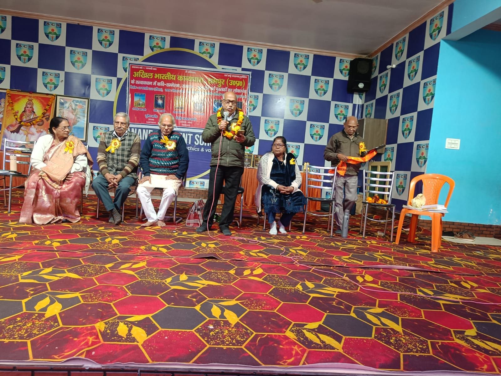 वरिष्ठ कवि रामकिशोर वर्मा ने भारत के स्वर्णिम अतीत और पतन के कारणों का कुछ इस अंदाज में बखान किया और सबकी प्रशंसा अर्जित की-“सोने की चिड़िया था भारत, वीरों की थी कमी न भाई, लाख हमारे वहां एक था, कहो गुलामी फिर क्यों आई?” नीलमरानी सक्सेना ने यह सरस गीत सुनाकर सदन को तालियों से गुंजायमान करवा दिया-चांदनी रात में अर्चना आपकी, चाहती हूं करूं वन्दना आपकी।”