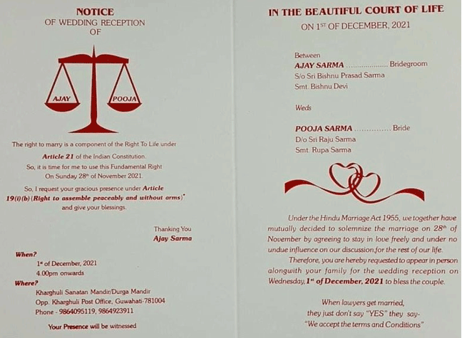 कार्ड में लिखा है कि विवाह का अधिकार भारतीय संविधान के अनुच्छेद 21 के तहत जीवन के अधिकार का एक घटक है। इसलिए, यह मेरे लिए इस मौलिक अधिकार का उपयोग करने का समय रविवार 28 नवंबर 2021 को है। निमंत्रण में आगे कहा गया है कि-जब वकीलों की शादी होती है, तो वे ‘हां’ नहीं कहते हैं, वे कहते हैं -‘हम नियम और शर्तों को स्वीकार करते हैं।