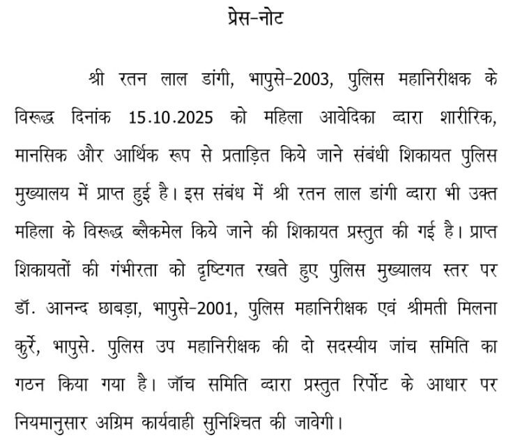 वहीं पुलिस सूत्रों से मिल नहीं जानकारी के अनुसार रतनलाल डांगी ने भी डायरेक्टर जनरल पुलिस अरुण देव गौतम को एक पत्र दिया है जिसमें उन्होंने यह लिखा है कि महिला उन्हें ब्लैकमेल कर रही है. लेकिन इस बात की समीक्षा नहीं हो पाई है कि महिला उनको कैसे ब्लैकमेल कर रही है और यह महिला से किस तरीके से संपर्क में आए हैं. इन तमाम बिंदुओं को लेकर के पुलिस मुख्यालय ने एक जांच टीम को गठित किया है जो इस पूरे मामले की जांच करेगी.